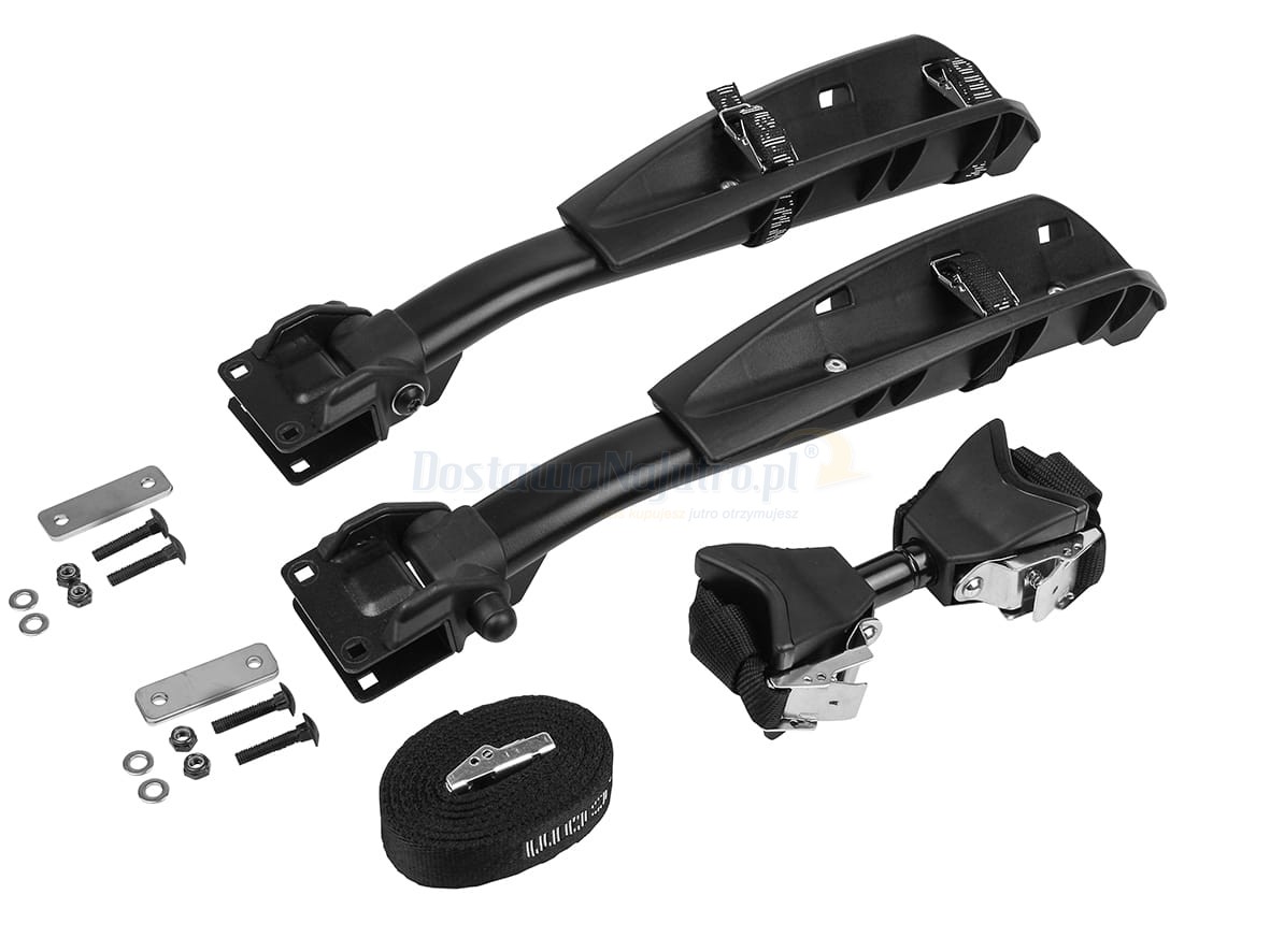 - Zestaw zawiera: uchwyt ramy: 1 szt., akcesoria: 2 szyny, 2 ograniczniki kół, 3 małe paski, 1 pasek odciążający, oraz materiał montażowy