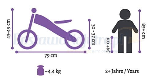 - idealny już dla 2-letnich dzieci, od 85 cm wzrostu i od 31 cm długości nóżki